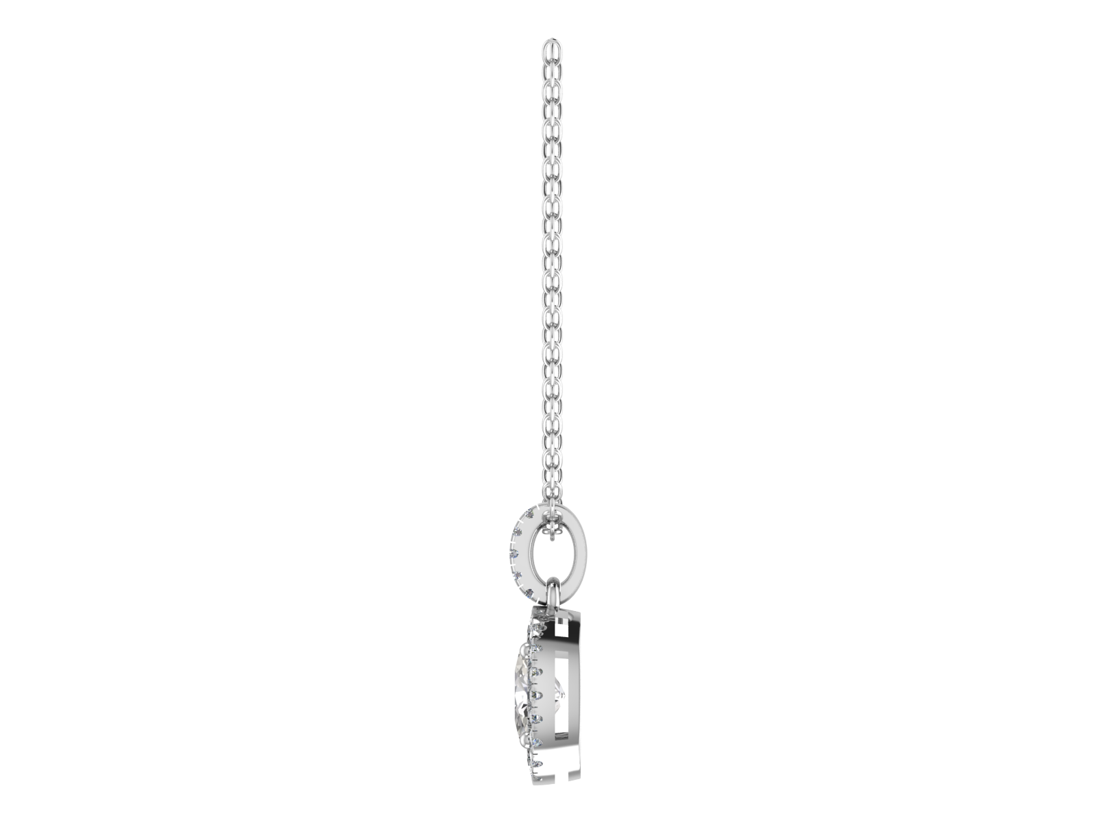 Our Oval Pendant features a secure four-claw setting, that elegantly cradles your gemstone. The pendant is adorned with a pave set halo and bale, adding an exquisite touch of sparkle and enhancing the brilliance of your oval-shaped stone. Perfect for any occasion, this pendant captures and reflects light beautifully, adding a refined touch to your look.
